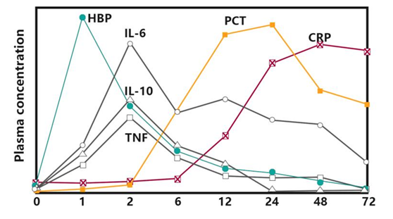 欧洲多中心研究发现,在脓毒症发生前72h即可在患者体内测得HBP浓度增加;在脓毒症发生前10.5h,大部分患者出现HBP浓度增加。与其它生物标志物相比,HBP是发生器官功能障碍的最佳预测指标。
