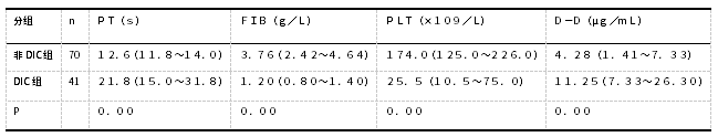 凝血标志物在各组的分布情况看,DIC组的PT和D-D水平高于非DIC组,FIB和PLT值低于非DIC组,两组差异有统计学意义(P<0.05).