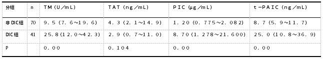 DIC组患者的纤溶标志物TM、PIC和t-PAIC水平均高于非DIC组,差异有统计学意义(P<0.05);而TAT值虽然低于非DIC组,但差异无统计学意义(P>0.05).