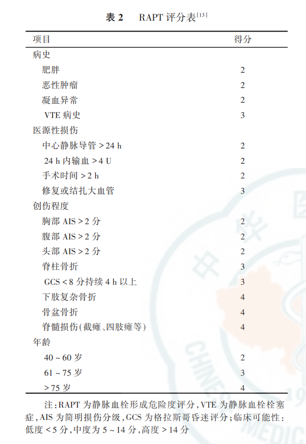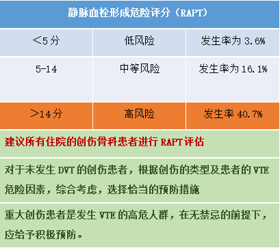 RAPT评分表是针对创伤患者提出的静脉血栓形成危险度评分法,用于预测VTE发生风险的标准化评估模型,其包括病史、创伤程度、医源性损伤及年龄4个方面因素,能够有效预警创伤患者发生VTE的风险。
